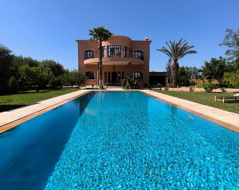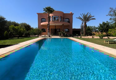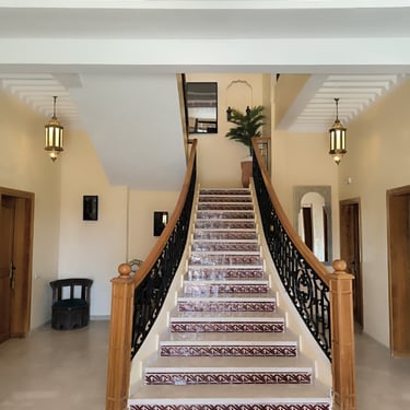 Édifiée sur un domaine de 6000 m2 soigneusement entretenu, la propriété dévoile un superbe jardin planté d’oliviers, de palmiers et de fleurs aux mille couleurs. L’architecture, typiquement marocaine, marie avec élégance des matériaux nobles et authentiques pour créer une atmosphère à la fois raffinée et authentique.